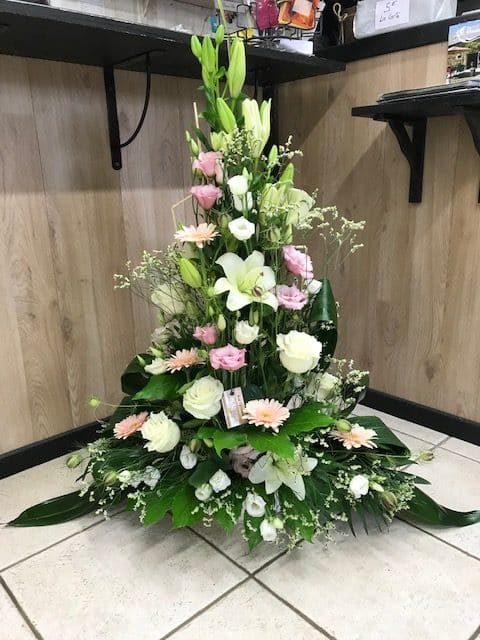 Contrairement à un bouquet, dans une composition les fleurs sont piquées dans de la mousse florale qui a été au préalable imbibée d’eau.